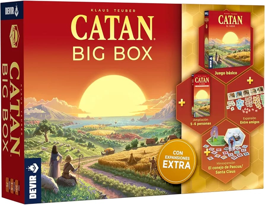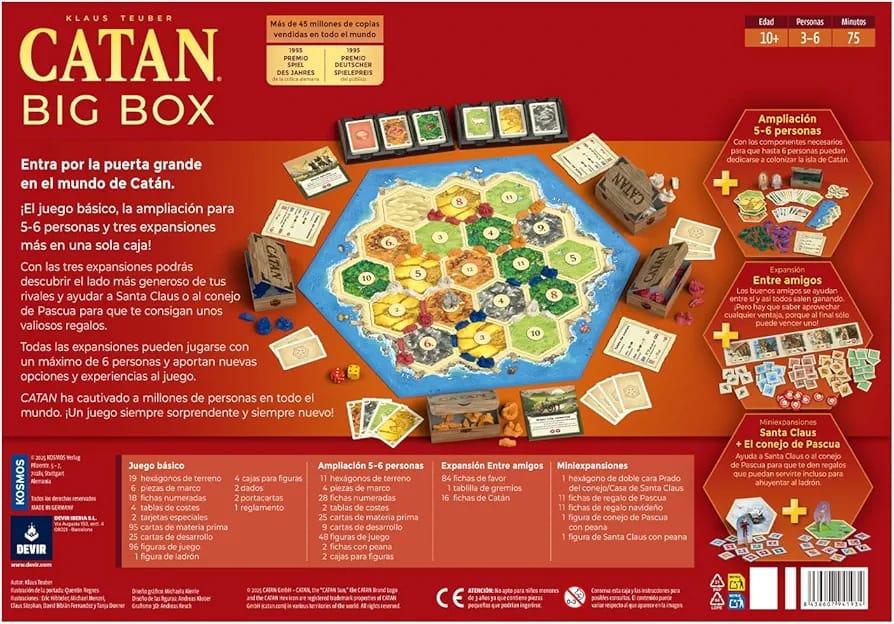Catan Big box Incluye, Catan el Juego, Catan Ampliación para 5 y 6 Jugadores, la Expansión Entre amigos, y 2 mini Expansiones (el conejo de Pascua y Santa Claus).