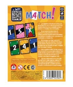 Match es un juego de cartas en el que tu objetivo será conseguir el mayor número de puntos posible hasta llegar a 50. Para ello, tendrás que emparejar las cartas por su valor numérico o por su color, y conseguir esa puntuación con las que no combinen. La mecánica del juego es sencilla. Los jugadores empiezan la partida con 5 cartas en la mano. Cada turno, colocan una carta en la pila de descarte del centro de la mesa. El número o el color deben coincidir con la carta que haya en la pila de descarte. La partida termina cuando alguien se queda sin cartas en la mano. Sin embargo, lo que más les interesa a los jugadores no es colocar sus cartas en la pila de descarte, sino en una colección de cartas delante de ellos. Al final de la partida, estas cartas son las que aportan puntos.